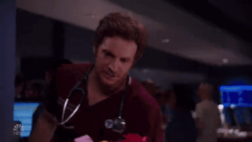 Dr. Will Halstead (Nick Gehlfuss) from Chicago Med takes a moment to smell a bouquet of colorful flowers.