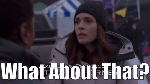 Natalie Manning from Chicago Med questions with 'What About That?' while talking to a man.