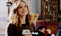 Erin Lindsay from Chicago PD holds a coffee cup in a donut shop, looking thoughtful.