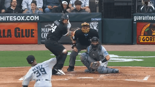 Yasmani Grandal, wearing number 24 for the Chicago White Sox, swings at a pitch during an MLB game.
