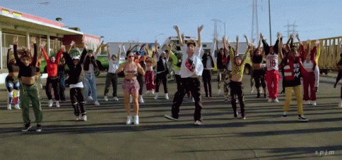 Jhope and Becky G lead a vibrant group dance in a parking lot for 'Chicken Noodle Soup'.