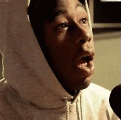 Man in a hoodie with a surprised expression and open mouth, with the text 'GUAU' appearing on screen.