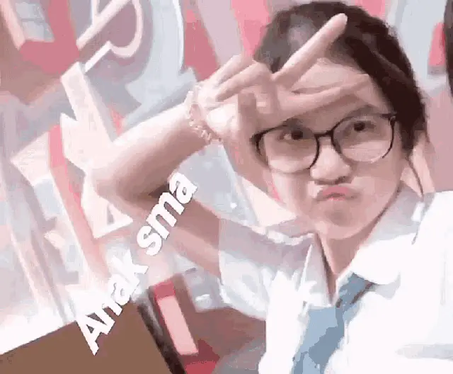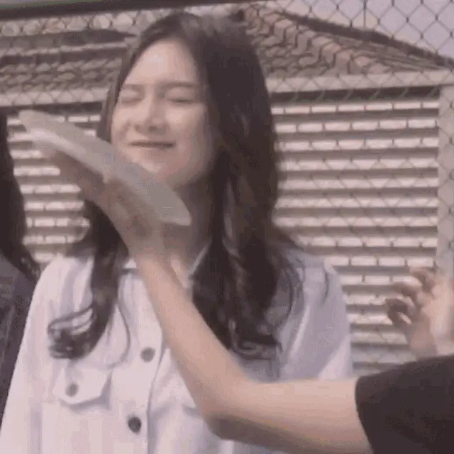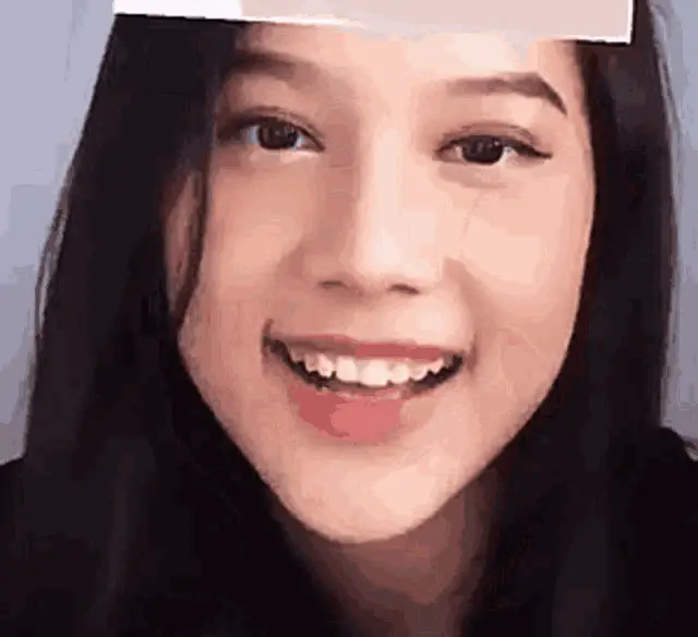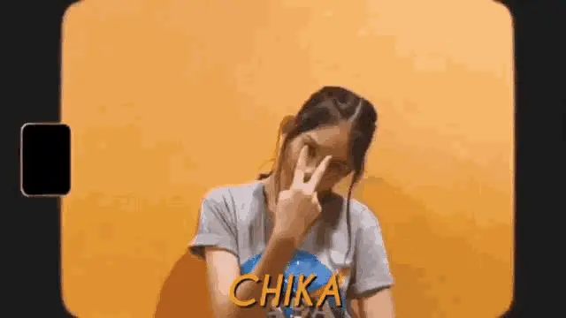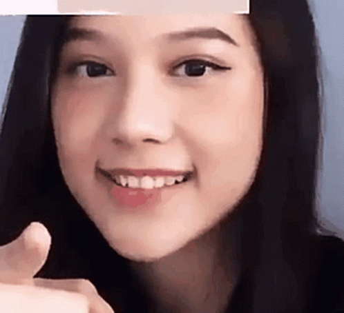 Chikuy, a cute young girl, smiles brightly and points towards the camera, possibly using a fun filter.