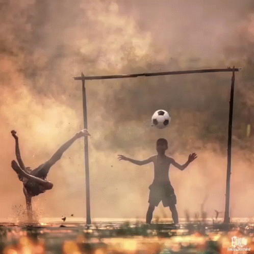 Two boys, including Prashant Gangwani, joyfully play soccer in the water, with one performing an acrobatic flip.