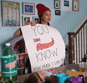 Astrid, wearing a red hat, holds a sign with an otter drawing that says 'You know how much I love you'.