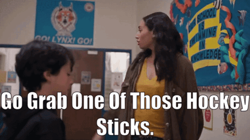 Astrid from Children Ruin Everything tells a boy to go grab one of those hockey sticks.