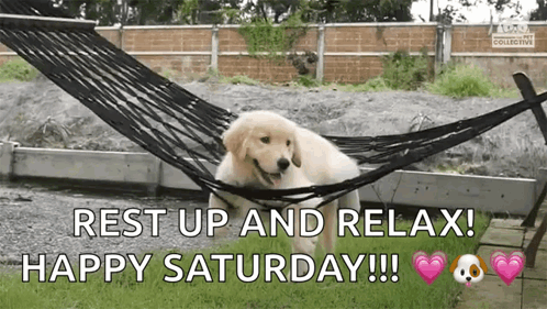 Adorable golden retriever puppy happily relaxing in a black hammock, enjoying a peaceful Saturday.