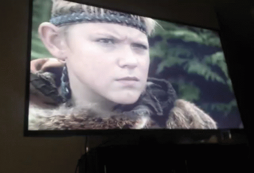 Two men in historical attire are seen on a TV screen, as someone chills while watching a movie.