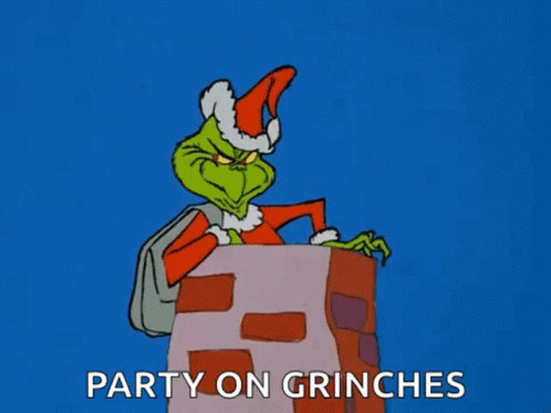 The Grinch, dressed as Santa, emerges from a chimney with the text "PARTY ON GRINCHES" displayed below him.