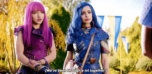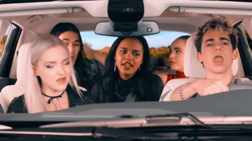 China Anne Mcclain, Sofia Carson, Dove Cameron, Cameron Boyce, and Booboo Stewart having fun in a car.