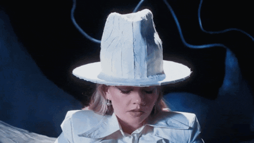 a woman wearing a white hat and a white jacket