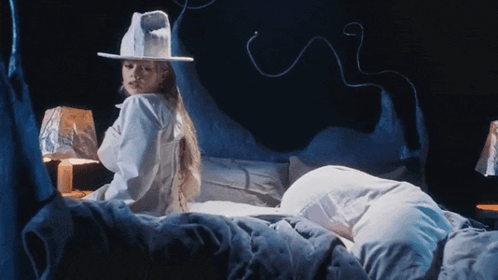 a woman in a white hat is laying on a bed