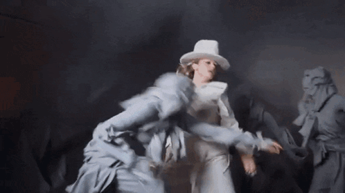 a woman in a white hat stands in front of a group of statues with the word eu written on the bottom
