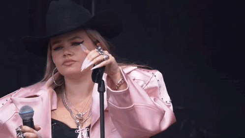 a woman wearing a cowboy hat is singing into a microphone