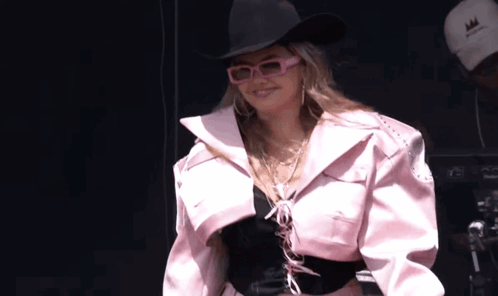 a woman wearing a cowboy hat and pink sunglasses is smiling