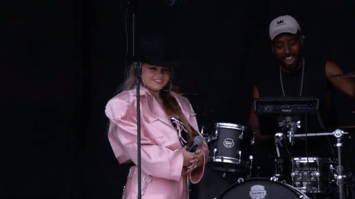 a woman wearing a cowboy hat and a pink jacket stands in front of a keyboard