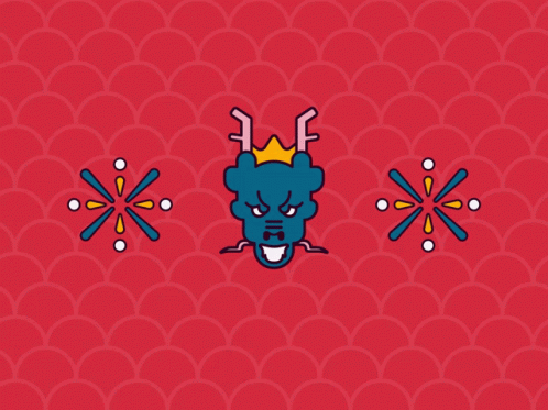 An animated blue dragon with a crown on a red background, celebrating Chinese New Year.
