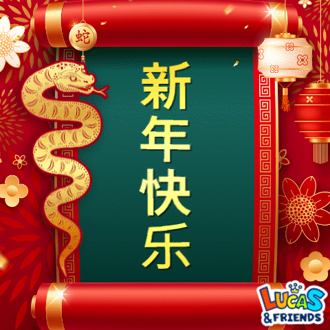 Animated greeting card for Chinese New Year, featuring a golden snake and 'Happy New Year' in Chinese.