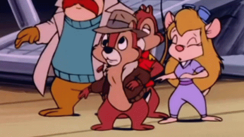 Chip, Dale, Gadget Hackwrench, and Monterey Jack from Chip 'n Dale Rescue Rangers in a scene.