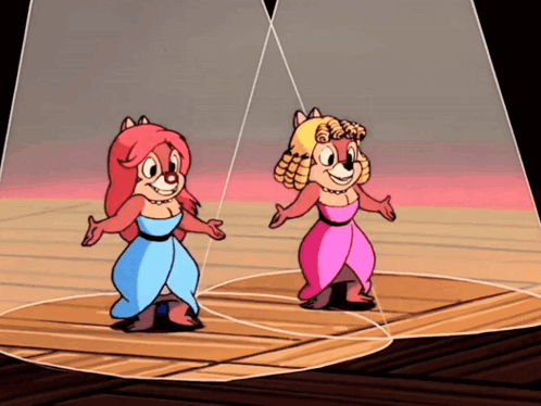 Chip 'n Dale, dressed as female characters with wigs and dresses, perform a synchronized dance on stage.