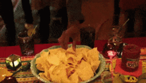 People enjoying Tostitos chips and salsa at a lively party with drinks and festive decorations.