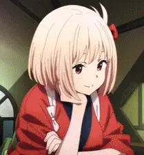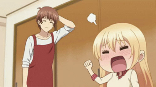Chisato Mizusawa, in chibi form, reacts with a wide-open mouth while a man in an apron smiles.