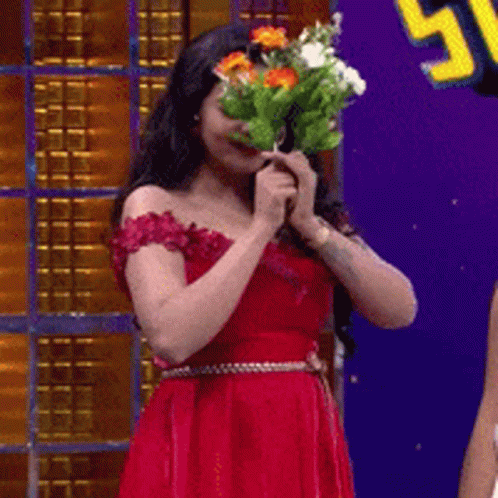 Chithu Vj, known as Mullai, in a red dress, smiling and holding flowers on a TV show set.