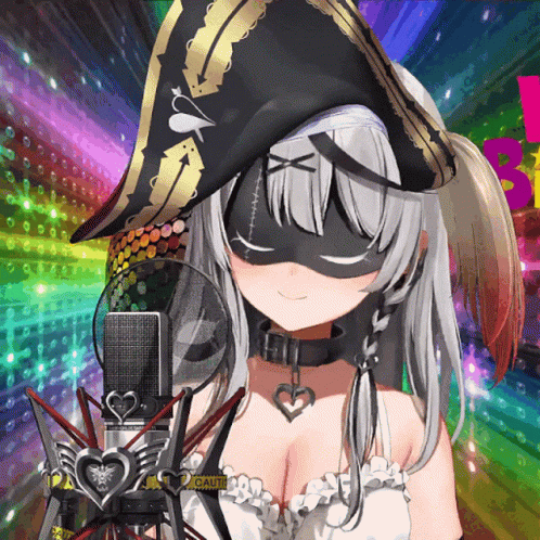 a girl wearing a pirate hat and a mask is holding a microphone with a caution sign on it
