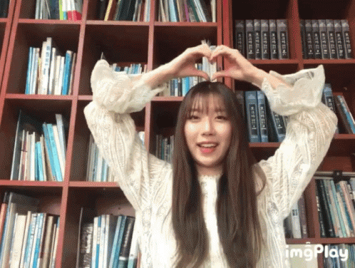 Chloris Mijin from the girl group makes a heart gesture in front of a bookshelf.