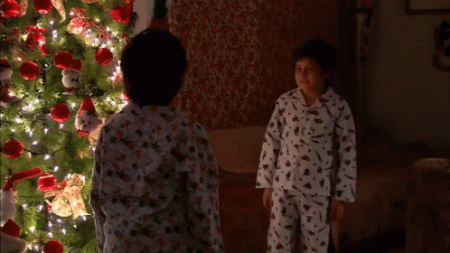 Two children in pajamas high-five in front of a Christmas tree, celebrating a moment from La Rosa De Guadalupe.
