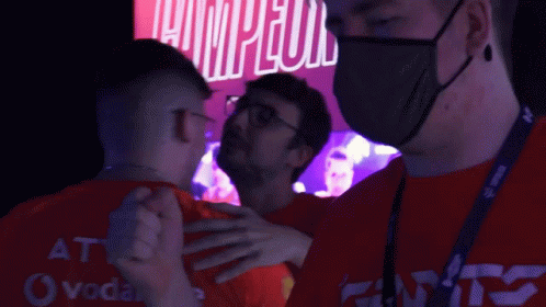 Attila and Jandro from Giants Gaming celebrate their victory, giving fist bumps and thumbs up under a 'CAMPEONES' banner.