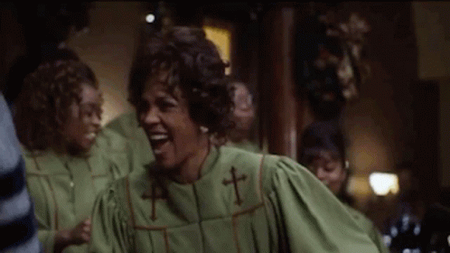 Whitney Houston joyfully sings in a gospel choir, wearing a green robe, in a scene from The Preacher's Wife.