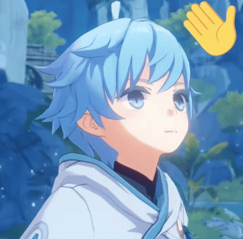 Chongyun, the blue-haired character from Genshin Impact, with a waving hand emoji above his head.