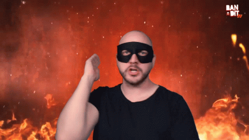 A bald man in a black mask exclaims 'CHEH!' against a fiery background.