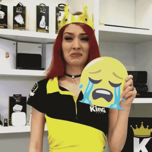 Ana Maria Lopes, wearing a King shirt and crown, holds a crying emoji cutout while making a sad face.