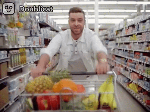 A man with a beard and white jacket smiles while pushing a grocery cart filled with fresh produce down a supermarket aisle.