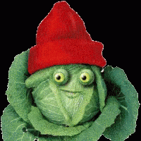 Chou, the green cabbage character, wears a distinctive red hat and has large yellow eyes.