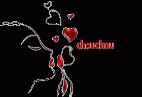 A line art drawing of a woman blowing a kiss, with red hearts and the word 'chouchou'.