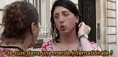 Chouchou, in a wig and makeup, expresses being in an international mess to another person.