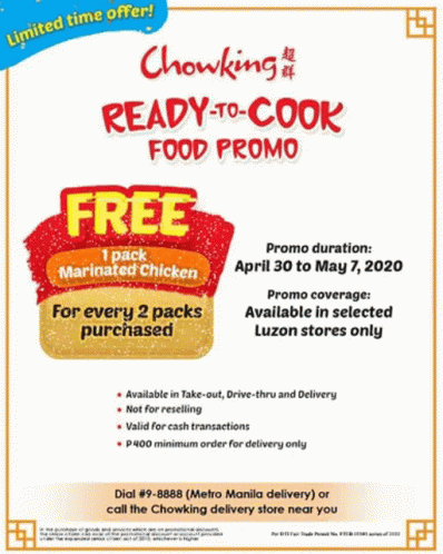 Chowking's limited-time promo for ready-to-cook marinated chicken, offering a free pack for every two purchased.