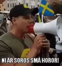 Chris Dulny shouts 'You are Soros's little whores!' into a megaphone at a protest in Sweden.