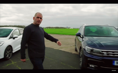 Chris Harris stands with a dark blue Volkswagen Tiguan and other cars on an airfield for a comparison.