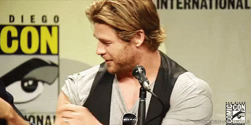 Chris Hemsworth shows off his impressive arm muscles at Comic-Con, engaging with the audience.