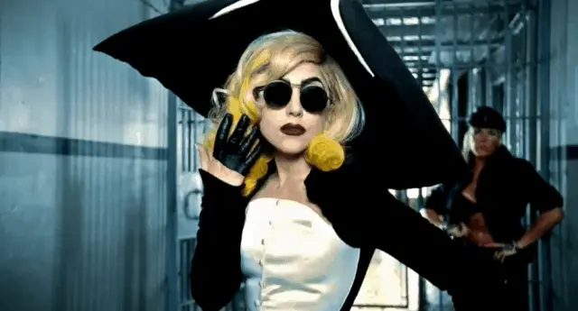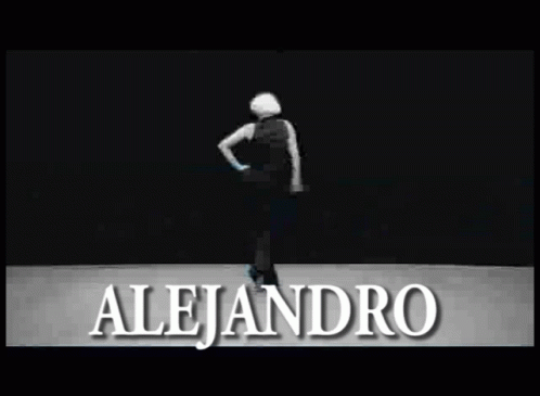 Lady Gaga in a black and white clip from her iconic 'Alejandro' music video, featuring the song title.