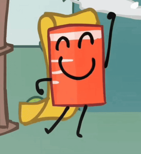 A red object show character with a smile on its face performs a silly Christmas dance.