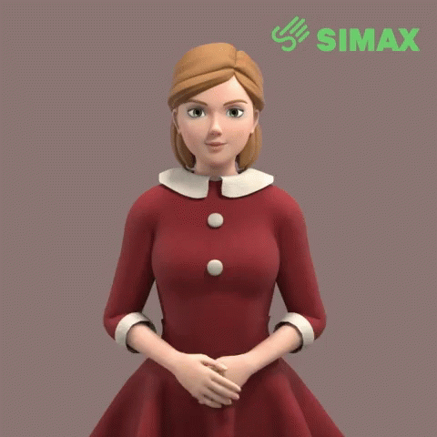 An animated woman in a red dress signs 'Merry Christmas' using International Sign Language.
