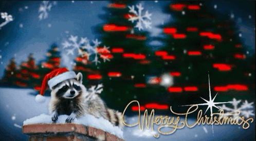 A charming raccoon wearing a Santa hat sits on a snowy chimney, wishing 'Merry Christmas' amidst festive trees.