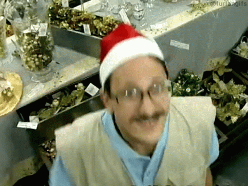 Daniel Furlan, wearing a Santa hat and glasses, waves and smiles, wishing a Merry Christmas.
