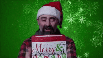 A bearded man in a Santa hat opens a Christmas gift bag, revealing a pair of socks and a look of surprise.