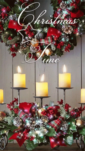 Festive Christmas decorations featuring a wreath, candles, and holiday accents with 'Christmas Time' text.